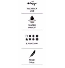 • Max Lumens: 20 Lumens• Sorgente luminosa: COB• Fascio luminoso: 260°• Distanza visibilità: 800 m• Batteria: 3.7V, 240 mAh• Tempo di ricarica: 1.5 ore (5V, 1A)• Durata batteria: 30 ore• Impermeabilità: IPX6, impermeabile a forti getti d'acqua•...
